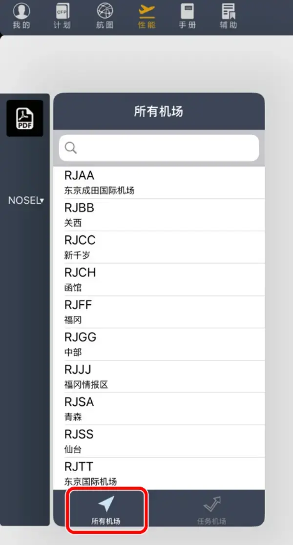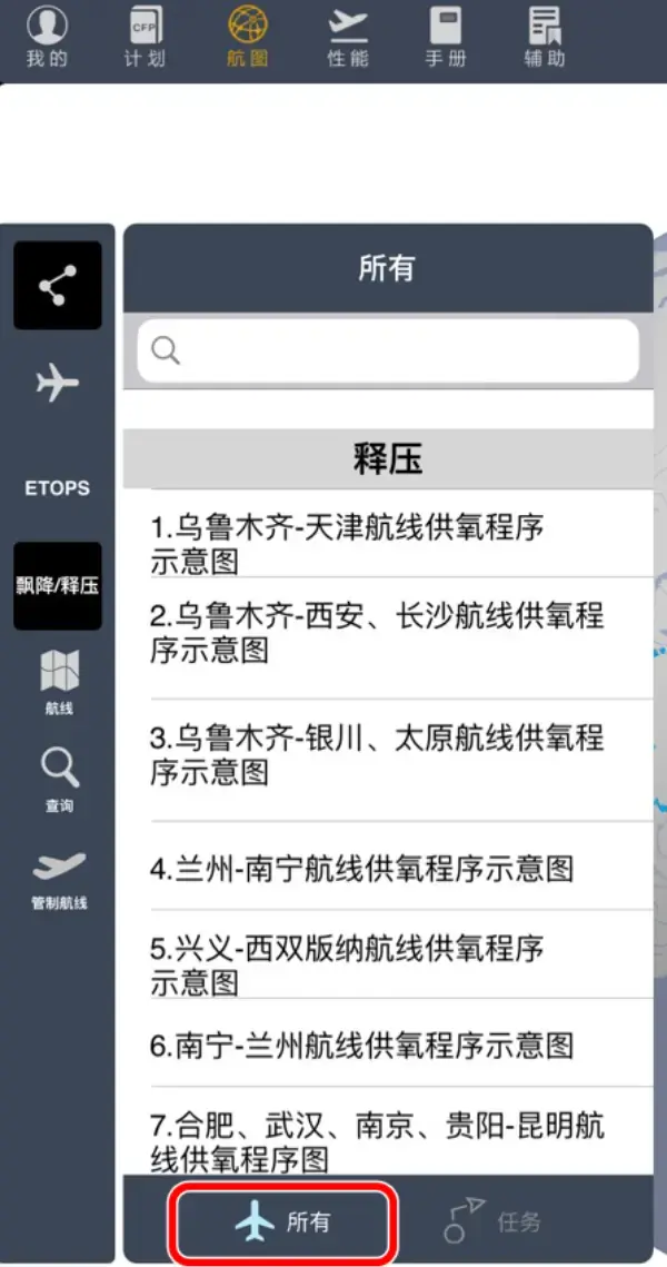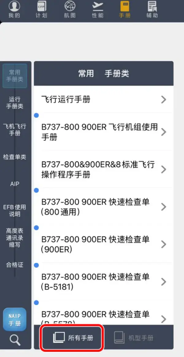 操作2: 若已关联航班,EFB软件默认显示已关联航班的飞机机型对应的手册,请在飘降/释压模块选择“所有”,请在性能模块选择“所有机场”,请在手册模块选择“所有手册”。